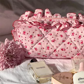 Vintage Floral Quilted Lace Makeup Bag – Large Capacity Cosmetic Pouch
